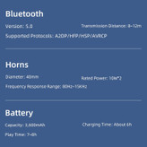 مدت زمان شارژدهی در حالت پخش موسیقی حدود 7 الی 8 ساعت، مجهز به دو عدد درایور 40 میلی متری صدا با توان خروجی کل 20 وات